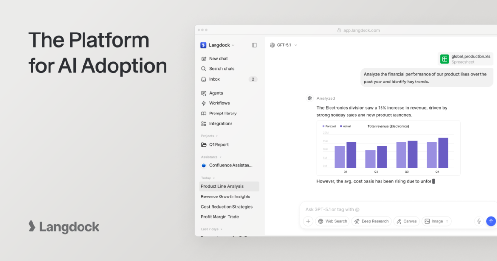 | Langdock | Platform for AI adoption | Yes (positioned) | Yes (varies by setup) | Moderate | Adoption platform + advanced use cases |