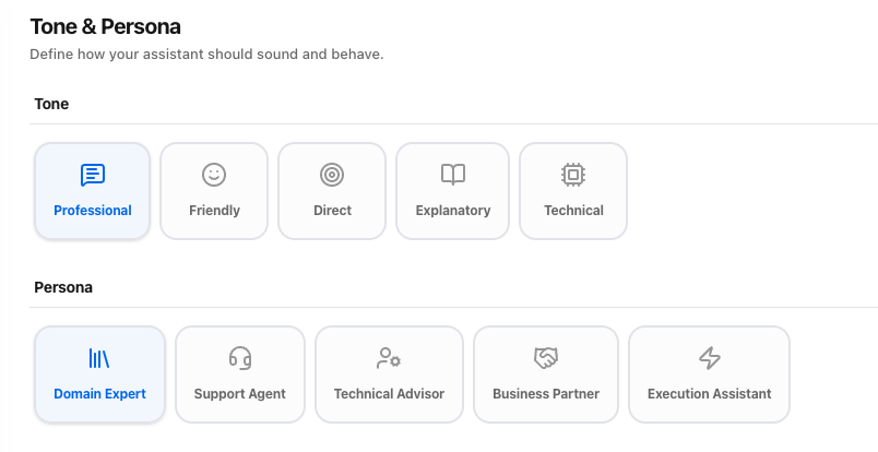 Define how your assistant sounds and who it acts like — from professional or friendly tone to roles like support agent, domain expert, or business partner for consistent responses.