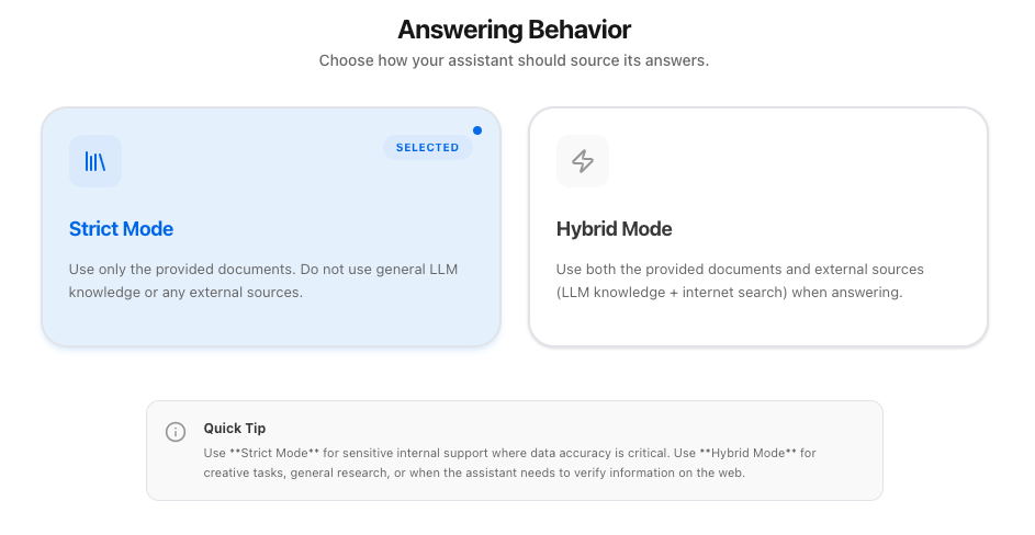 - Strict Mode: Answers only from the specified knowledge sources. No open-ended reasoning, no external information.