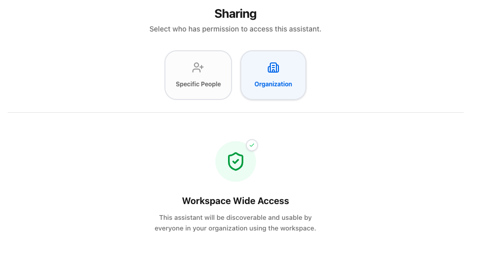Anyone in the workspace can create an Assistant. The creator decides who can access, use, or collaborate on it — specific people, teams, or the entire organization.