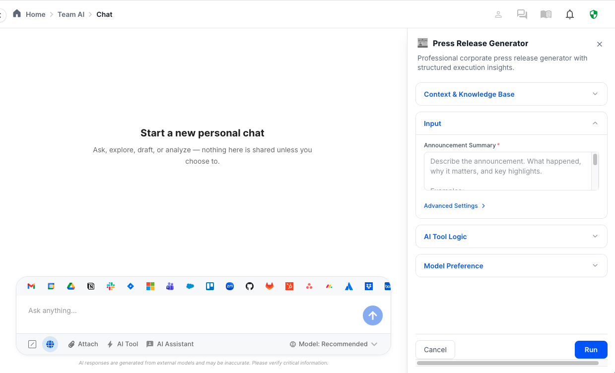 AI Tools in WorkLLM are designed to produce the same quality output every time, regardless of who runs them. Structured inputs, shared context, and controlled instructions eliminate the variability that comes from free-form prompting so teams stop reinventing the same work.