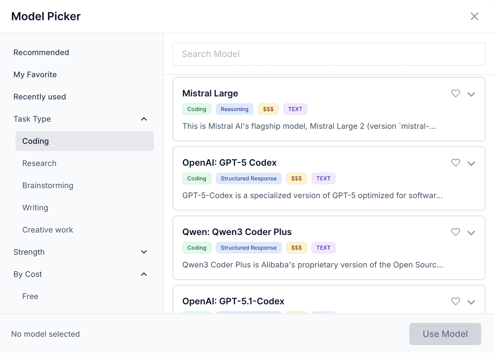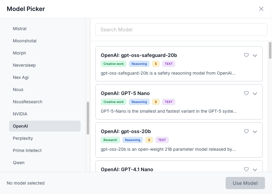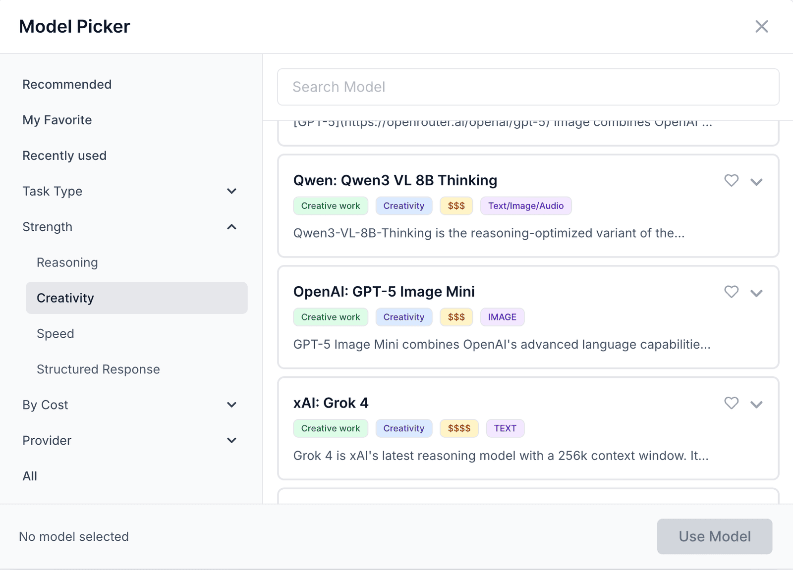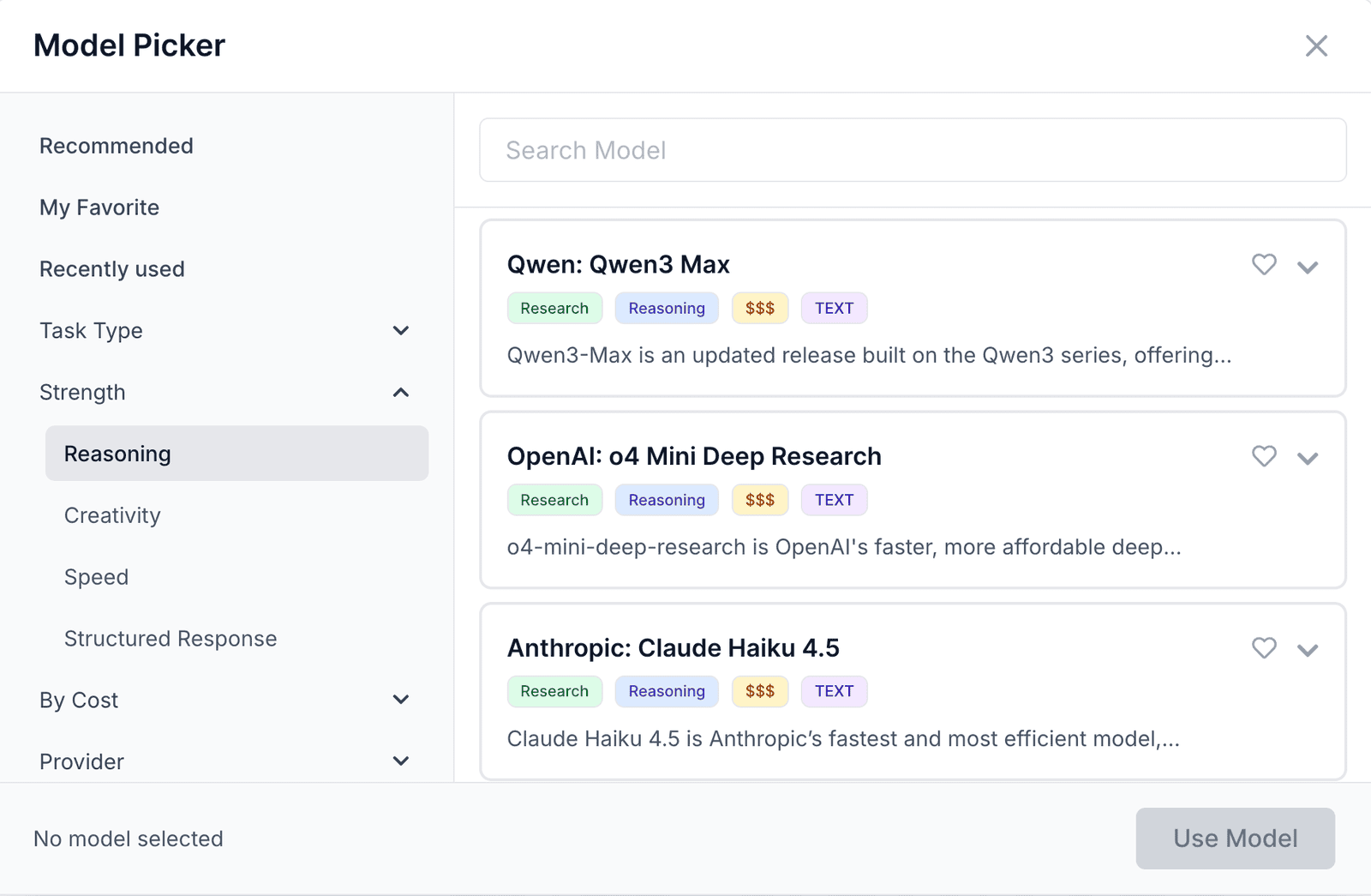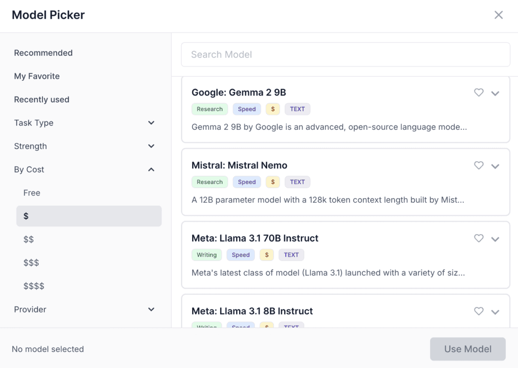 You can select models based on task type, strength (reasoning, speed, creativity), cost, or provider. WorkLLM clearly labels these options to make selection simple.